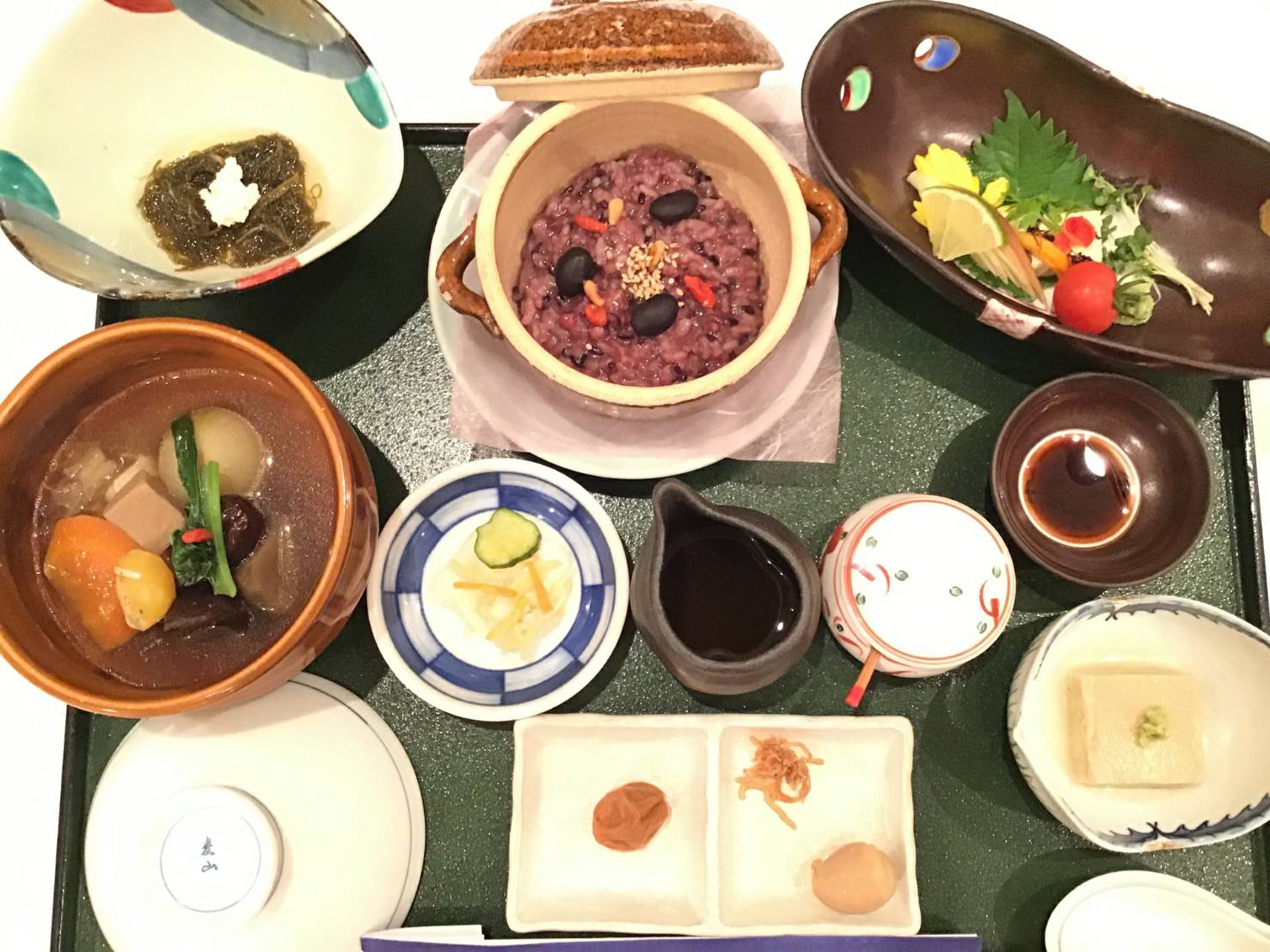 (黒米雑穀粥、小鉢、季節の煮物、生湯葉の刺身、糸もずく、香の物、水菓子、薬膳茶)
